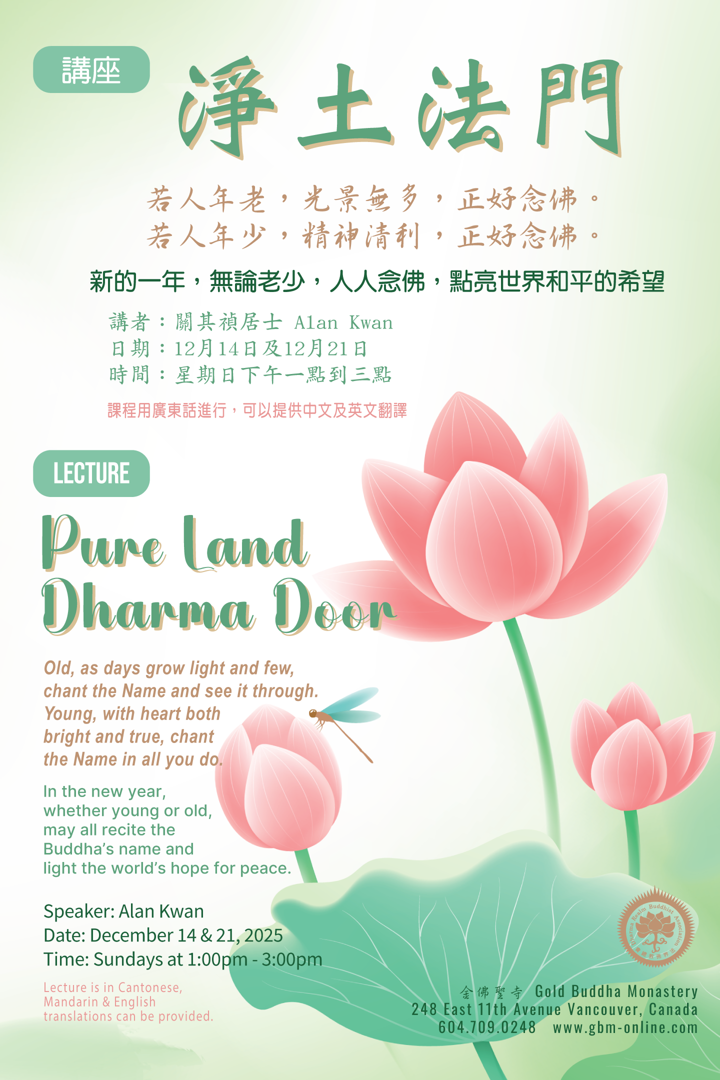 講座 講座:淨土法門 November 30, 2025 若人年老,光景無多,正好念佛。 若人年少,精神清利,正好念佛。 新的一年,無論老少,人人念佛,點亮世界和平的希望 講者:關其禎居士 Alan Kwan 日期:12月14日及12月21日 時間:星期日下午一點到三點 課程用廣東話進行,可以提供中文及英文翻譯 Share